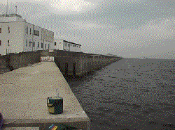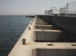 桟橋から高いところ、つまりスリットにも行くことができます。スリットの形状については第一コーナー紹介を参照して下さい。この第一コーナーのスリットの外側へチョイ投げしてアコウ(キジハタ)が釣れた実績があるそうです。スリットにはチヌなどが居着いており、昨年の真冬の2月12日には、私自身47.5cmと38cmのチヌをあげました(新聞にも載りました~_~)。