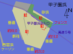 甲子園浜近辺の釣り場紹介です。 東側の角から内向きは砂地となっていて、カレイやアナゴが狙えます。尼エサの情報では東側と西側が「スリット」になっていますが、まったくスリットはありません。東側は非常に浅く、対して西側は深くなっています。セイゴやキビレを狙う人が多いようです。海沿いはかなり広く、バーベキューをしているグループもあります。 甲子園浜釣り場甲子園浜東側の垂直(浅い!)