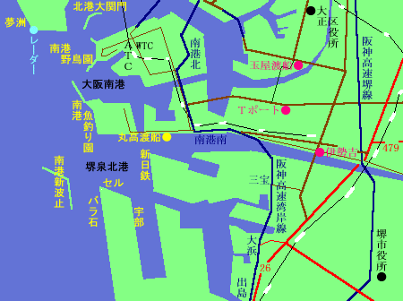 Tポートと伊勢吉は釣り道具及びエサ屋です。年中カニも売っていますし、エサ類は安くて豊富にあるようです。丸高渡船でもエサは売っています。落とし込み用のフジツボやミドリイガイはシーズン中の丸高渡船でのみ手に入ります。丸高渡船の駐車については渡船店付近の路上駐車になります。渡船店付近に行けば、大量に車が路上駐車しています。春夏秋には丸高渡船主催の南港チヌ釣り大会や落とし込みの大会も開かれていて、東西の著名人が集合します。私は一昨年から毎回行っていますが、勝負弱いのか一度も釣ったことさえありません。先にうまい人に落とされるとまずその場所では少なくとも十数分は釣れません。うまい人がほとんど南港へ集合していますので、北港などへ行った方が確率的に良く釣れるのではないかとも思っていますが・・・。