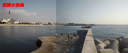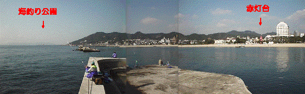 外向きはテトラになっていてタチウオやすずき、メジロ、カレイ、ヒラメの絶好のポイントとなっています。タチウオのシーズンになると、イワシなど小魚が浜の浅瀬に真っ黒になるほど寄っていて、ちょっと細かめのタモでいくらでもすくえ、タチウオのエサを持っていく必要がありません。駐車場は市営のものがあり、5時間以上\1,600-です。
