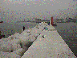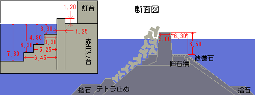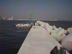 全長1237.5mの波止で南側(港外側)にテトラが入っている。北側は垂直で、竿1本分ほどは少し水が澄めば底が見えるほど浅く、1〜1.5ヒロしかない。内側は少し飛ばすと砂地のところがほとんどで、カレイやキス、アナゴも釣れ、真鯛(40cm程度)が釣れることもある。外側は、航路筋などは極端に深い所があり、森下渡船には50cmのイシダイの魚拓有り。水平な波止から、この大きなテトラとの隙間で穴釣りすると20cm台のガシラが良く釣れる。専門に狙う人多し。とにかくここは魚種が豊富で、エビさえ持っていけば必ず何か釣れるのが魅力。