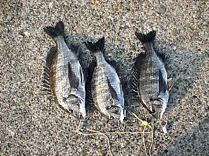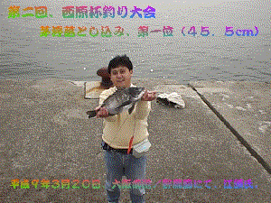 釣りは私と南方氏がシラサのエビ蒔き、他の3名が前打ちです。最初に一度エビがかじられただけで、後の午前中はまったくあたりがありませんでした。周りもまったくチヌ/ハネとも上げていません。前打ち組もまったくダメでした。ただ、大会の終わる寸前に一度あきらめて釣りをやめていた森川君がひつこくやっていた穂積君をひやかしに行って隣で一枚35cmを上げてしまい、皆坊主のはずが予定が狂ってしまいました。午後からは森川君の近所の友人(3/9の人)が来て、16時半まで続けましたが、森川君が2枚(40cmと34cm)追加。エビ蒔きの人が1枚で、他にはまったく上がっていませんでした。私は・・・午後からは2回のアタリがありましたが、結局魚は乗りませんでした。あーあ、いつになったら浮き釣りのハネが釣れるのだろう?