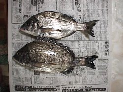 鳥取県弓が浜展望台の海岸八防での35.5cm(下)と31.0cmのチヌ  | | | |