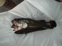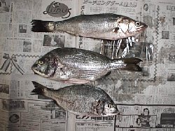 今日は「変わったところへ行こう」と言うことでちょっと言えない所で釣りをしてきました。7時半頃まではアタリもあまりなく、底の状態を探っているとイシダイやイシガキの子(サンバソウ)が結構来ました。その後11時頃までは散発的にアタリがあり、私は一枚(40cm)でしたがそこそこ楽しめました。キピレのほとんどいないところだと思っていたのに穂積君が1枚と森川君が2枚キビレを上げて少し驚きました。