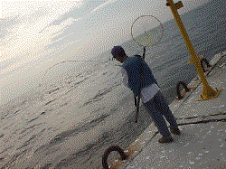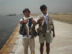 朝3時半の船で行くつもりが、台風の残した風で船が出たのが4時半、帰りは9時指定。しかも水銀灯のみ。こちらとしては元々水銀灯の予定だったのですが、他の釣り人も全員水銀灯になって、人が多いと予定の7時までの「こすり」ができない? いろいろ思案したものの結局7時まで「こすり」。最初の1投目と2投目、10分そこそこで42.5cmと46cmのハネをゲット。幸先は良いが、後はセイゴのみ。南方氏の浮き釣り最長寸は35cm。当日はシラサのエビ蒔きで、新聞等で有名な上手い人も来ていましたが、浮き釣りは皆セイゴばかりだったよう。7時からの2時間弱の落とし込みは2回あたったものの釣果なし。