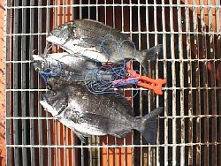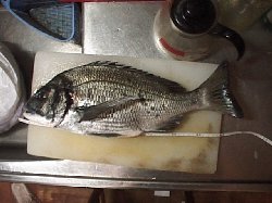 朝は江頭君と穂積君と行きました。朝早くは人は少なかったのですが、海は池のように静かで釣れる気がしません。あちこち行き来してもエサ取り(フグ?)くらいでまったく誰にもアタリは無く、ストリンガーも掛かっていない状況でした。ようやく外向きで8時頃最初のアタリがあり、すごく元気なチヌで、ハリス1号ハリ2号だったのと合わせ苦労しました(実はかなり時間がかかったのと苦労したのとで、浮き釣りの5〜6名のギャラリーから拍手をもらってしまいました、ちょっとテレ臭かったと言うか恥ずかしかったというか・・・)が、なんとか43.5cmを取りました。分散して釣っていた落とし込み士が一斉に私の周りで釣り始めたのには参りましたが、8時前頃から少し潮が良くなってきたようで、帰りに見たら1本ストリンガーが掛かっていました。今日のチヌはお父さんが魚好きの江頭君にあげたので写真はありません。