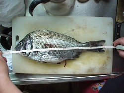 森川君はと言うとまったくアタリも無く8時頃から次の10時の船を待っていたそうです。それでも9時過ぎに最初で最後のアタリを取って1枚下げて8防へやってきました。午後からは、大阪から落とし込みの上手い人が多数来て落とし込み士の多いこと。私はアタリが2〜3度あり、カニを潰されたりしましたが、結局朝の1枚だけでした。中島氏が40cmを1枚、タンクの爪で14時頃釣ったのが目立ちましたが、「朝からアタリすらない」と言って回っている人がいるほどで、我々の他には、干潮になってストリンガーに首吊り状態になっているチヌを1枚見ただけです。私のチヌの胃の中は稚貝でいっぱいでした。今日はだいたい1ヒロ半から2ヒロでアタッていましたが、午前のは森川君の4防のも入れて30cmほどの小さなものばかり。中島氏は、もちろん数には入れていませんが、1匹20cm台も上げていました。腹の中にいっぱい子は持っていましたが、大きさがかなり不満・・・この時季なのに。