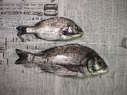 一旦帰って寝ていたら近所の和田さんから電話があったのを思いだして連絡したら、またまた行くことに。今回は「高校生の息子(ノブ君)に落とし込みを教えてやってくれ」と。とりあえず釣れそうな所へ行って一通り自分もやりながら教えてあげました(帰りに、3枚ぶら下げている人に聞いたら、アタリは3時までは結構あったが3時からはほとんど無くなったと、ナント言うことだ!)。そしたらそしたら、ノブ君はなんと35.5cmを取ってしまいました。私はと言うと、目印が沈みきって「次へ行こうとしたらチヌがついていた」アタリが2度と、目印が沈みきる直前の引き込み1度、止まりの聞き合わせが1度の計4回。引き込みはかなりやりとりをしたのですが何度目かの締め込みでハリ外れ(逃がした魚は大きい!)。止まりも2〜3度の締め込み後ハリ外れ。チヌが付いていたアタリは2回とも2度目の反転でハリ外れ。要は4回とも中途半端にしか合わせを入れられなかった結果、結局1枚も取れません(姿も見られません)でした。今日の夕方の失敗は、最初にオモリを海にバラ撒いてしまって(落としてしまって)Bしか無くなってしまったこと。オモリをこまめに変えていればもう少しアタリがあった(と思う)し、あったアタリももっとはっきり分かった(はず)。竿捌きワーク、仕掛けワーク、エサワークの3大ワークのうち、仕掛けワークの4大要素、ハリとオモリとハリスと目印のオモリに不自由した結果でしたが少し情けない! ま、教えながらでしたし、教え子のノブ君が初めての落とし込みでチヌを釣ったので満足しなければ・・・