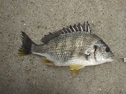 | 朝は神戸港で、相変わらず探り合い競争。目の前で釣られたり、釣ったり。とにかく人が多くて、人より多く落とした者勝ち。ちょっと出遅れたのですが、先週同様8時を回るとアタリもなくなってしまいました。でも人は多かったので、ザッと数えたストリンガーは私のを入れなくても14〜15本掛かっていて、内側はストリンガーが邪魔になって落とし込みができないほどでした。また、今日はクモガニを30匹持っていっていましたが、エサ取りの猛攻でアッと言う間に無くなってしまいました。エサ取りでは、25cm程度のグレを2つとフグを釣りました。 | で、用事を済ませた後、今度は先週から南方君とお約束の大阪北港/夢洲桟橋に行きました。イカを狙いたかったのですが、なんと昨年の4月4日以来の大阪北港です。結局、強風の中スリットへ落とし込みに。高いスリットが久しぶりなのと風が強いのとで、なかなかうまく落とせない。1度だけ引っかかりを外したらアタリだったようで、グイッときてスバリでした。で、17時半頃、風裏のクレーンへ。そうしたらあたるあたる・・・パンパンパン。38cmのキビレが来たあと、連チャンで26cmと24cmとスバリ(4連続アタリなんて始めて・・・)。で、またその何投か後、今度はキレイな止まり。これは思いっきり突っ込まれて、3mの目印+矢引きハリス+5〜6m道糸を出され、巻いても巻いても突っ込まれて、目印が水面に出てこない。一瞬50cm程度の大きさを想像してしまいましたが、ようやく取り込んだのは45cmの元気なマチヌでした。で、18時になったので取りあえず落とし込みは止めてイカ釣りに・・・結局、南方君がシラサでコウイカを1つ釣っただけで、8時半の時間切れ終了までキビナゴ仕掛けにはカスリもしませんでした。周りでは何ハイかのちっちゃなヤリイカは上がっていたようです。 ![]() |