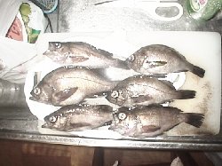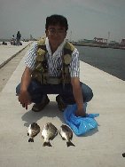 | 今日は南方君と神戸港に行きました。きれいな引き込みでアタリます。8時半までに5回アタって3枚取って、8時半を過ぎてからはアタリ無し。10時半頃やっと40cm台中程のが乗り、突っ込ませたり浮かせたりしながらギャラリーといろいろな話をしていて、そろそろタモを、と手を掛けたらハリが外れてしまいました。長くしゃべり過ぎて少し反省。 | 合計6回のアタリで、3枚の釣果。集中したのは8時半まで。暑すぎて集中力が無くなりいろいろと遊んでしまいました。残りの時間は南方君やギャラリー、昨日7防で会った人などと話をしたり、タコをやったりしていました。本日の南方君のシラサでの釣果は、23cmくらいのメバルと胴長25cmくらいのコウイカが一つづつに、ガシラとアイナメが数匹づつでした。チヌは他にも45cmくらいのを筆頭にして数枚上がっていたようです。 ![]() |