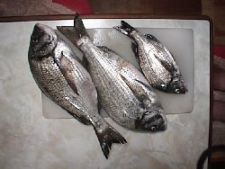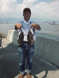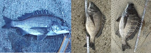 | どうしても船釣りに行きたくて、でも暑いのでだれも一緒に行ってくれず、「行く」と言ってくれたのは長男だけ。ただ、長男は中学のブラパンで県大会出場が決まってしまって午後3時まで学校。で仕方なくと言うか、半夜で須磨沖のメバル/タイ狙いに行きました。朝は閑だったので6防へ。あまりアタラないのといろいろな所で釣ってみたかったのとで、6防からいろいろと歩きまわって結局、チヌ3つとババタレ2つ。写真はババタレを除くチヌ。 | 昼前に家に帰って半夜の用意。わくわくしながら須磨の第三福丸へ。ほとんど人も居なくて半分貸し切り状態で、取りあえずメバル、メバル、メバル・・・結局、20〜28cmのメバルを2人で16でした。25cm以下は4つだけと言う大きさで、小豆島より良かった! ![]() |