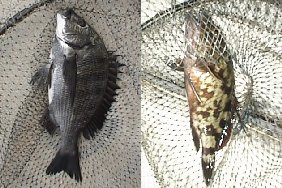 | 昨日釣りに行けなかった南方君からお誘いがありました。朝起きたら気分は治っていたので、結局、加島渡船の一番船で行きました。何人か5防への一発狙いの落とし込み士もいましたが、今日は「アコウを狙おう?」と、地エビを4ハイも買っていったのでした。でも、ゴミと急潮で仕掛けも落ち着かず、底撒きも(感覚的に、たぶん)キチンとできていない。じゃあ、脈でやろうとしたら、深さが12m程度に対し、脈専用竿(目印釣りでは最近全然使っていない落とし込み竿)の専用リールの糸が10m程しかない! 8時には諦めて、イガイをちょっと取って結局落とし込みを始めたのでした。 | 今日のトピックは「見えているチヌを釣った!」かも知れない!? 横を向いて落としていると、2mほど手前の私のすぐ前でヒラを打つチヌがいる。こんなのは、何度もあって何度もそこに落として、まったくダメ。でも、のぞき込み終わって体を引いた時だったし、チヌはヒラを打った後もゆっくりと潜っていったのでチヌには見つかっていないはず。と、ソーッと仕掛けを上げて4〜5歩後ろに下がり、潮上1mほどの所へソッと仕掛けを投入。1ヒロも無いところで、どちらかと言うと目印が引っかかったような感じで止まる。でもチヌのいた所だし、乗らなくて元々、と、サッと合わせると乗った乗った!! 写真の右手で持っている方のチヌを取りました。ちなみに普段なら、まずきいてしまいそうな止まりアタリでした。今日は4回当たって4回乗りました(取れたのは2枚)が、アタリはかなり渋くて、全部止まりでした。また潮も、ズッと、そしてかなり流れていました。他には2枚釣っていた人が1人いただけでした。 9時半頃には暑くなって、取りあえずちょっと休憩したら落とし込む元気が無くなり、その後はタコ。でも2ハイだけ。平日なので、13時まで船が無く、11時過ぎからは灯台の影で座ったまま半分寝ていました。 ![]() |