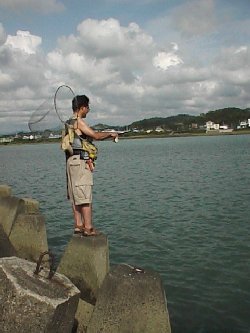 | 今日は最低! ラジオ付き乾電池蛍光灯等々を入れたデイバッグを無くしてしまいました。車の中にあったのですが、朝、6防に着いて乾電池を捜したときに車から出した?(ちゃんと車に戻したと思うけど)のか、帰って車の中を整理してみたら「無い!」。あのデイバッグ、高かったのに。ただ、ちょっと気になるのは、帰る時は何とも思わなかったけど、荷物スペース内のいつものものがいつもの場所になかったような気もします。たいしたものは入れていないので一番高そうなものだけ、車上荒らしされたんだろうか? もし、拾った人がいたらデイバッグだけでも返してくれぇーっ。 チヌは昨日と違い、全然アタらない。ヘンなアタリで一度アワせたら、昨日に引き続き、イガイなのにマルハゲが引っかかってくる。しかも2cmのイガイだったのにマルハゲは6〜7cm! そしてようやく6時過ぎに低い桟橋で、ピッのアタリでババタレが。エイッと抜き上げたらハリが外れて、コンクリのドルフィンにワンバウンドして反対側の海へ。またまたアタリが無くなって、ようやく8時過ぎ垂直でトマリ。アワせたら、竿がバシッと止まってググッと沖へ。「これは良いサイズ!」と思い、同行者の南方君が近くにいたはずなので見てみると、いない! キョロキョロと捜しながら突っ込みに耐えること2度。で、捜しているときに「アッ」とハリハズレ。やっとアタってまともなサイズだろうと思っていたので、思わず「あーっ」と結構大きな声を出してしまったのでした。何で声なんか出たんだろう? あー、ハズカシィ。8時半頃から暑くなって落とすのを止めてしまいましたが、朝はこの2回のアタリだけでした。 で、夕方、仕事を終わらせてから、無いとは分かっているものの、6防へスッ飛んで行きました。一通り駐車スペースから灯台まで歩いてみましたが、やはりデイバッグはありませんでした。悔しいので明るい内だけ高い桟橋だけで落とし込むと、止まりアタリでまたまたババタレ。暗くなる寸前に、沈みきった仕掛けを上げたら付いていたチヌが36cmでした。釣れたので「まぁいいか」・・・でも、「やっぱり良くない、今日はサイテェ!」。 |